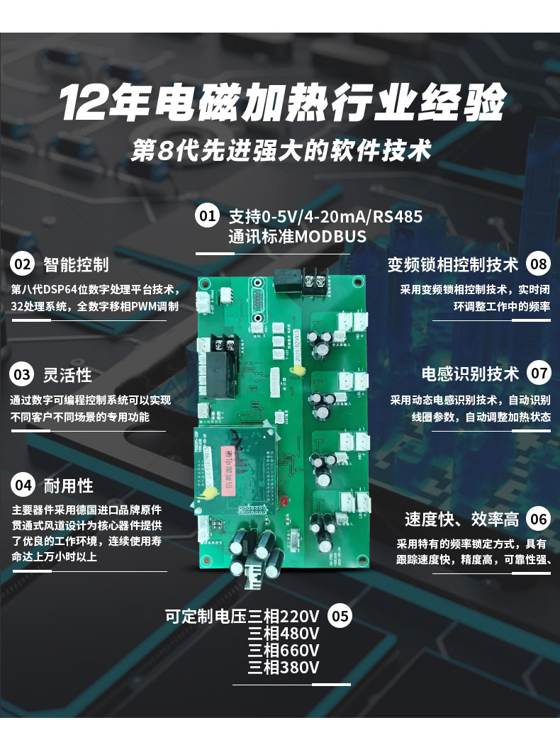 產品描述:信輝源電磁加熱器電路技術:工業級電路設計,配置德國進口英飛凌功率模塊,純進口全新電器元件--確保電磁感應加熱器在工作中穩定無憂。