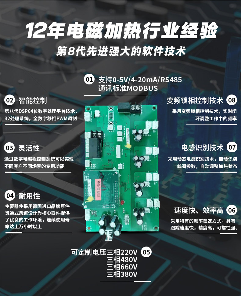 產品描述:?80kw電磁感應加熱設備采用德國進口模塊,信輝源牌80kw電磁感應加熱設備是常用規格之一,可以使用在造粒機,導熱油,采暖,加熱水,蒸汽鍋爐等等應用。免費保修一年,保用10年。