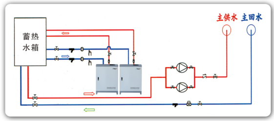 谷電蓄能供熱方案采用蓄熱裝置,蓄熱裝置在谷電負荷時加熱存儲熱能,以節(jié)約供熱成本,供熱方案原理圖如圖2所示。